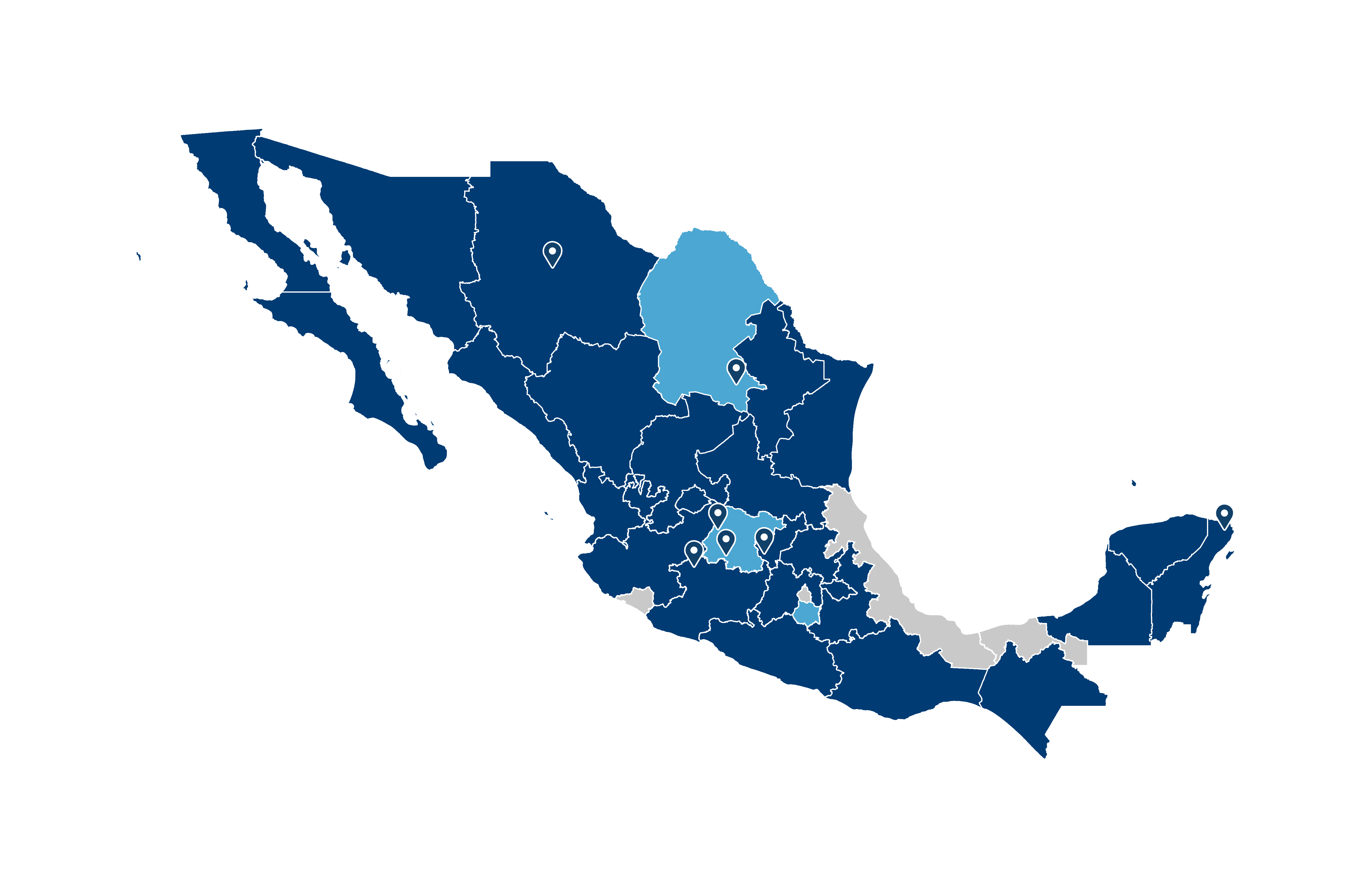 Aguascalientes | Baja California | Baja California Sur | Campeche | Chiapas | Chihuahua | Durango | Estado de México | Guerrero | Hidalgo | Jalisco | Michoacán | Morelos | Nayarit | Nuevo León | Oaxaca | Puebla | Querétaro | Quintana Roo | San Luis Potosí | Sinaloa | Sonora | Tamaulipas | Tlaxacala | Yucatán | Zacatecas